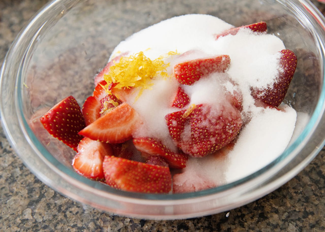 -في وعاء كبير ضعي كلاً من ( الفراولة - السكر - برش قشر الليمون - عصير الليمون ).