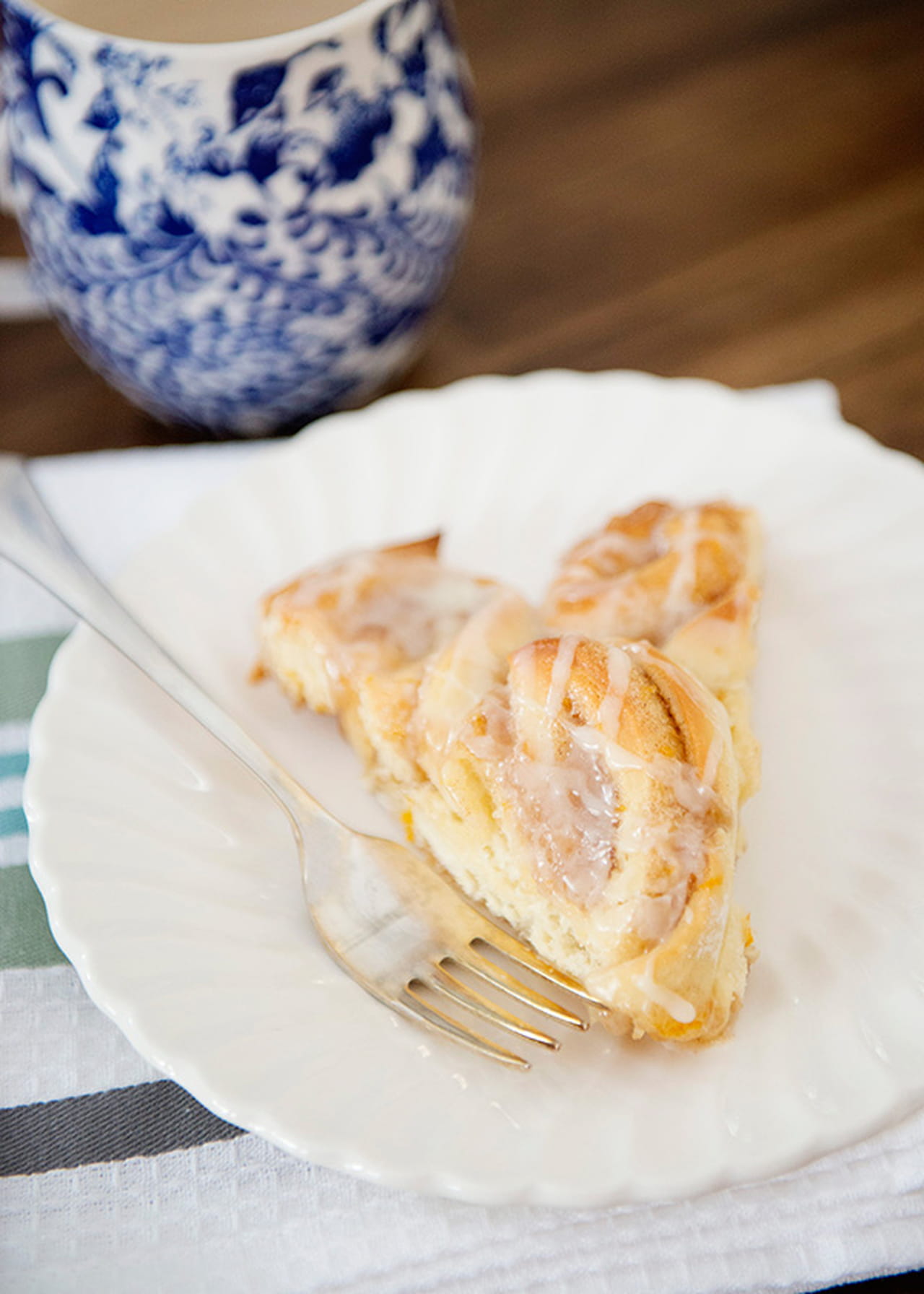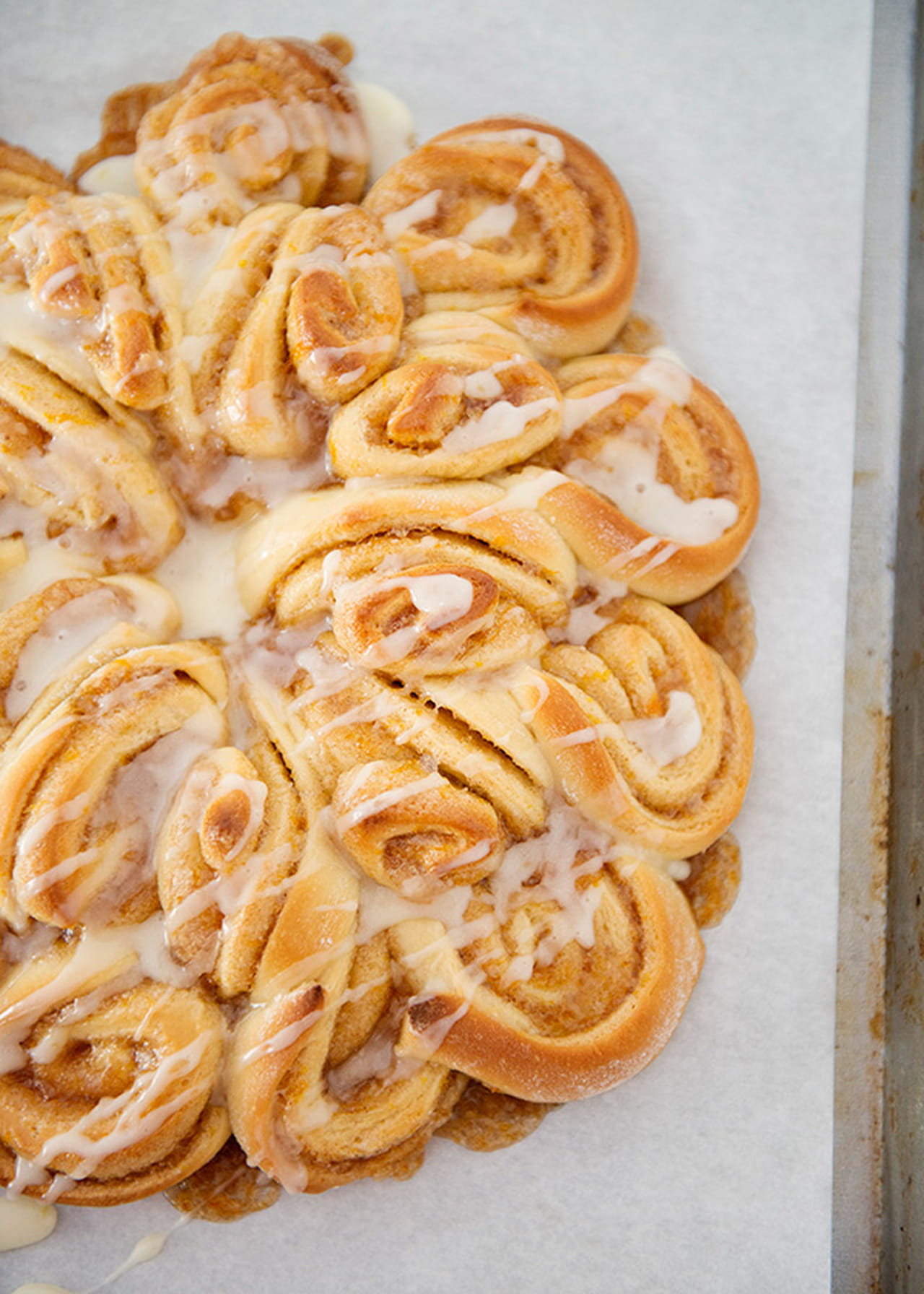 - ضعي الصوص الأبيض على سطح لفائف السينابون بالبرتقال ويقدم .
